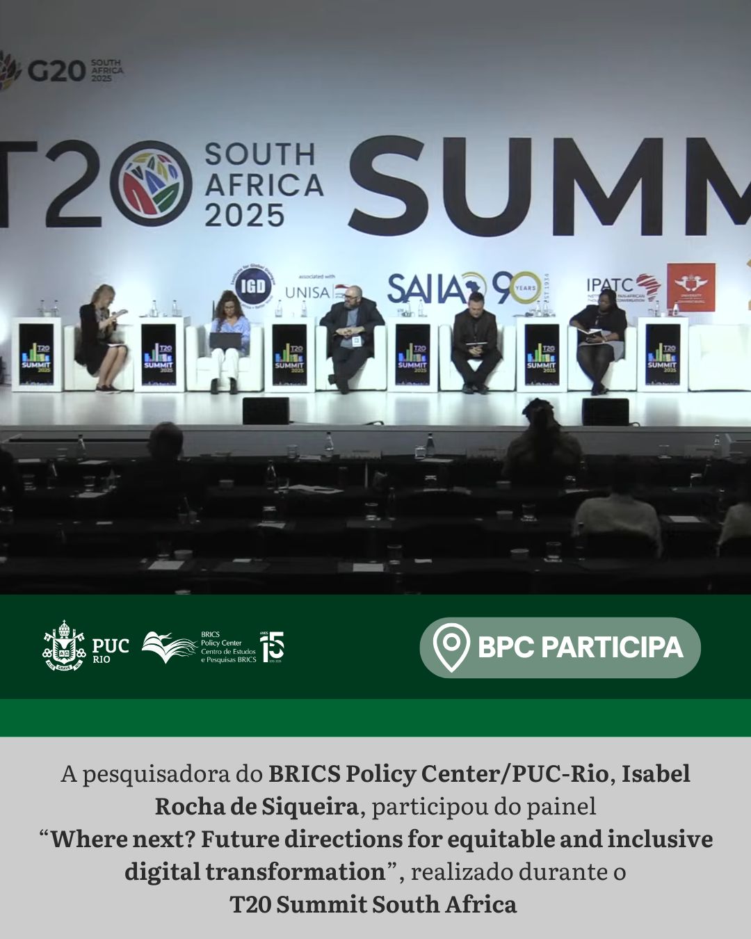 BRICS Policy Center/PUC-Rio researcher Isabel Rocha de Siqueira participated in the panel “Where next? Future directions for equitable and inclusive digital transformation,” held during the T20 Summit South Africa.