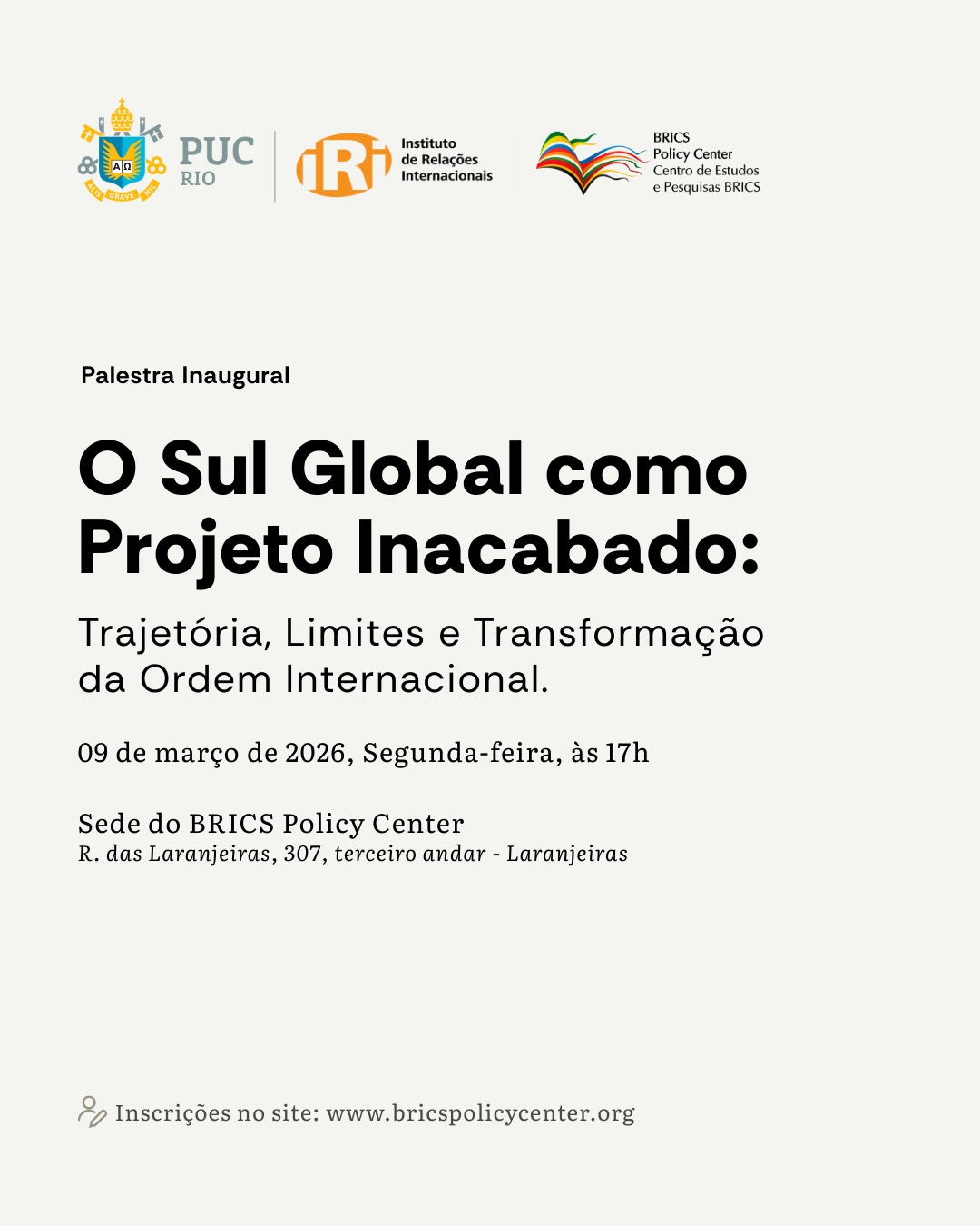 BRICS Policy Center/PUC-Rio will hold its 2026 inaugural lecture on March 9, entitled: “The Global South as an Unfinished Project: Trajectory, Limits, and Transformation of the International Order.”