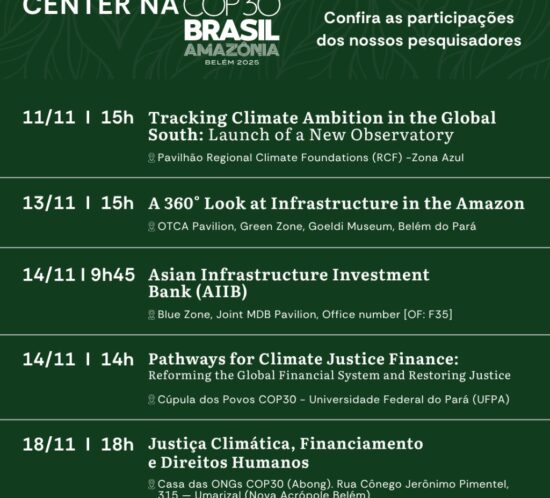 The BRICS Policy Center (PUC-Rio) will be present at COP 30 and the People's Summit, alongside numerous partner institutions. Check out our researchers' participations above. Will you be in Belém? Come...