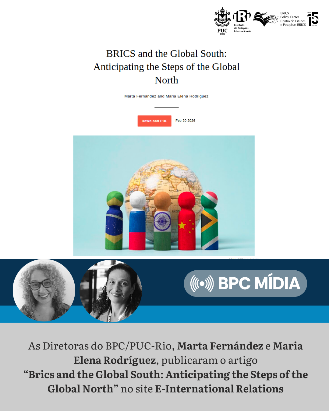 The Director of the BRICS Policy Center (BPC/PUC-Rio), Marta Fernández, and the Deputy Director of BPC/PUC-Rio, Maria Elena Rodríguez, published the article entitled “BRICS and the Global South: Anticipating the Steps of the Global North” on the E-International Relations website.
