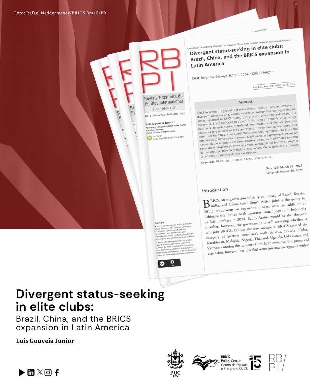 The article, entitled “Divergent status-seeking in elite clubs: Brazil, China, and the BRICS expansion in Latin America,” analyzes the divergent status-seeking strategies of Brazil and China in the context of BRICS expansion — a group initially composed of Brazil, Russia, India, China, and South Africa. The recent enlargement included new members and partner countries, generating internal tensions due to the different strategies adopted by Brazil and China to gain international prestige.