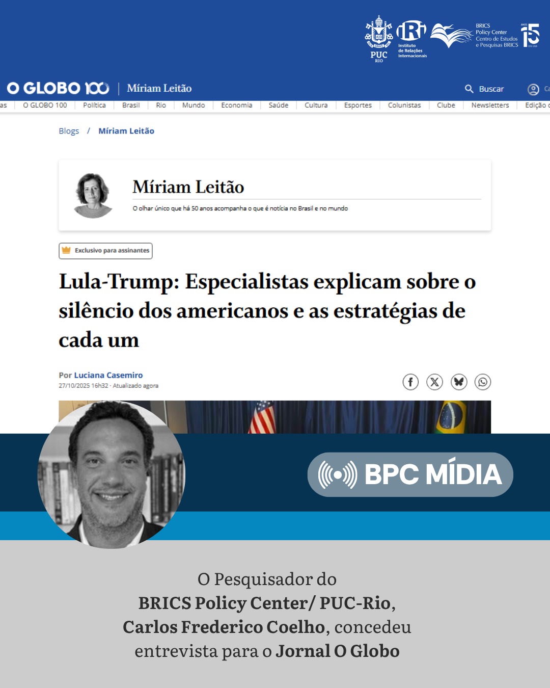The researcher at BPC/PUC-Rio and professor at IRI/PUC-Rio, Carlos Frederico Coelho, gave an interview to the newspaper O Globo