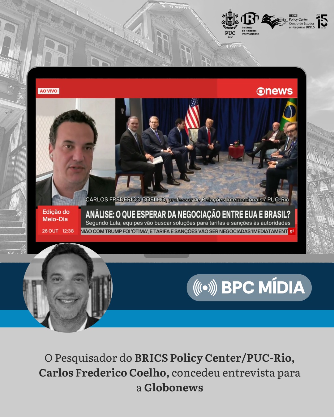 The BPC/PUC-Rio researcher and IRI/PUC-Rio professor, Carlos Frederico Coelho, gave an interview to Globonews on the midday edition to analyze the meeting between the President of Brazil and the President of the United States (USA). In his statement, the professor highlighted that the meeting represents a relevant geopolitical gesture, focusing on the resumption of trade negotiations between the two countries, after the period of tension caused by the imposition of the tariff increase.