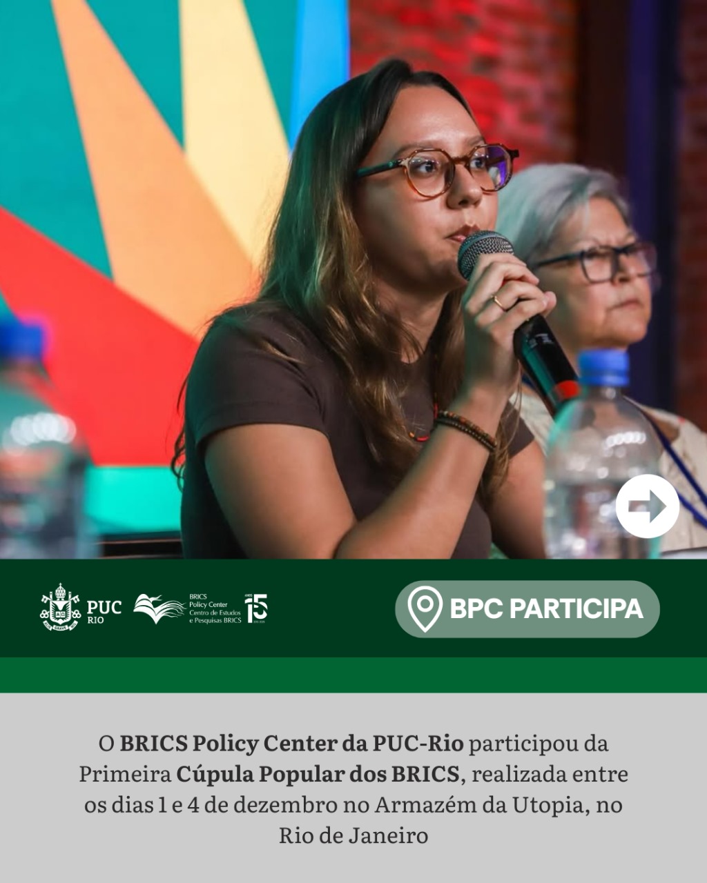 Entre os dias 1 e 4 de dezembro foi realizada a Primeira Cúpula Popular dos BRICS, no Armazém da Utopia, no Rio de Janeiro. O evento reuniu mais de 150 representantes da sociedade civil dos países BRICS e de outras nações do Sul Global, com o objetivo de construir uma agenda comum para o Sul Global ao longo de quatro dias de atividades. O BRICS Policy Center da PUC-Rio esteve presente durante várias atividades do evento.