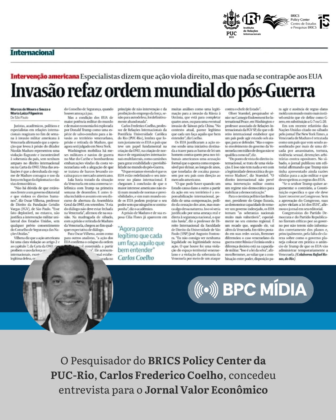 O pesquisador do BPC/PUC-Rio e professor do IRI/PUC-Rio, Carlos Frederico Coelho, concedeu entrevista ao jornal Valor Econômico sobre a intervenção estadunidense na Venezuela, intitulada “Invasão refaz ordem mundial do pós-Guerra”.