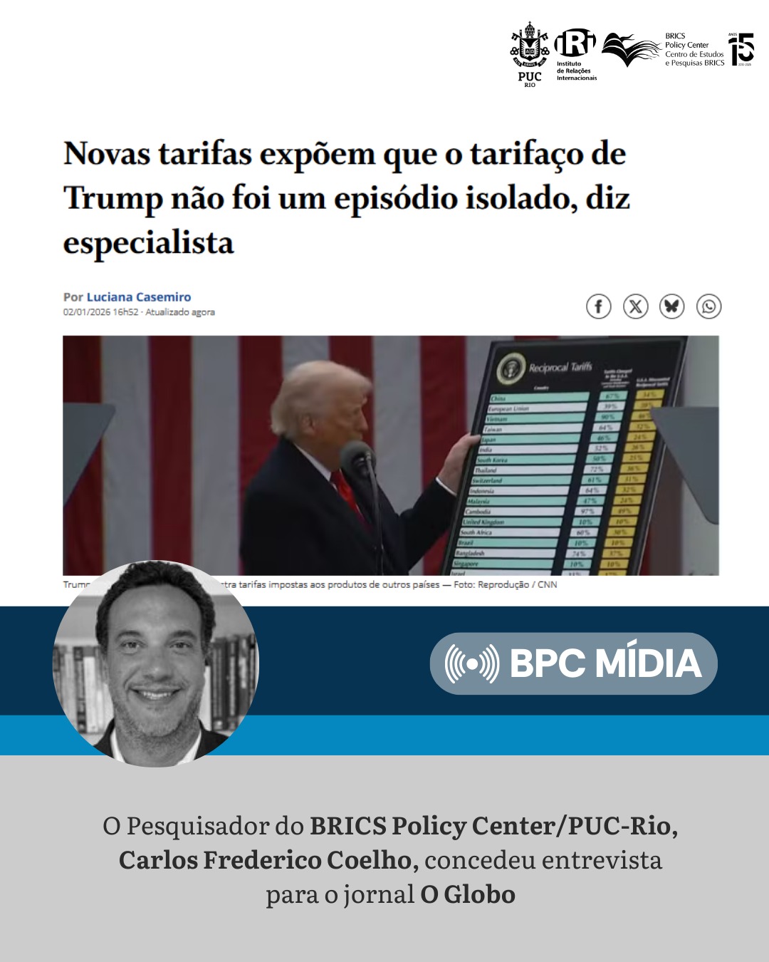O pesquisador do BPC/PUC-Rio e professor do IRI/PUC-Rio, Carlos Frederico Coelho, concedeu entrevista para o jornal O Globo: “Novas tarifas expõem que o tarifaço de Trump não foi um episódio isolado.”