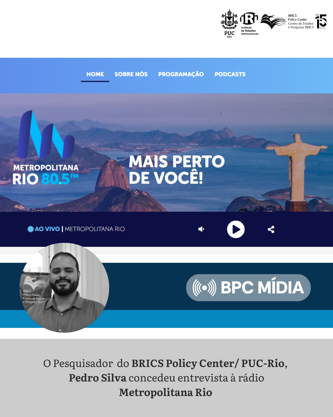 O pesquisador do BPC/PUC-Rio, Pedro Silva, concedeu entrevista para o podcast Intriga Internacional da rádio Metropolitana Rio