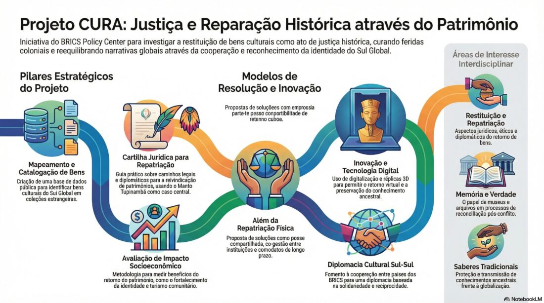 O Projeto CURA – Justiça e Reparação Histórica através do Patrimônio propõe investigar a restituição de bens culturais como forma de justiça histórica e reparação das heranças coloniais. A iniciativa busca fortalecer as identidades do Sul Global e promover novas formas de cooperação internacional baseadas na solidariedade e na reciprocidade.